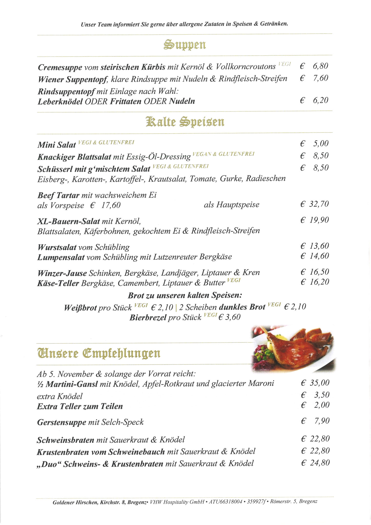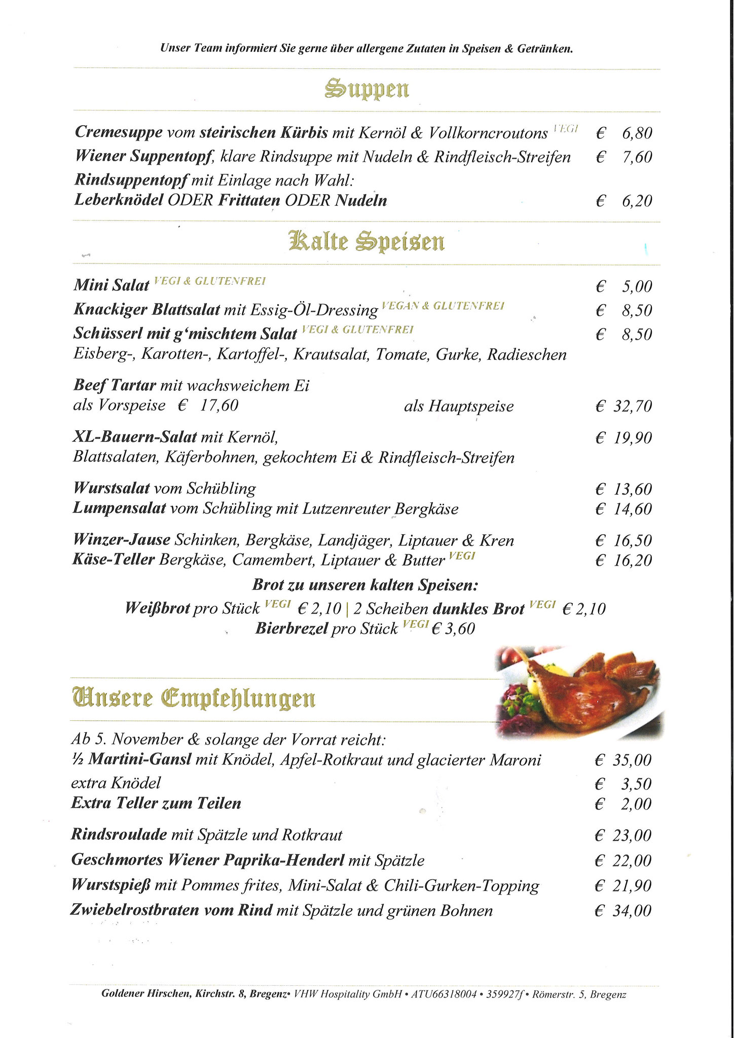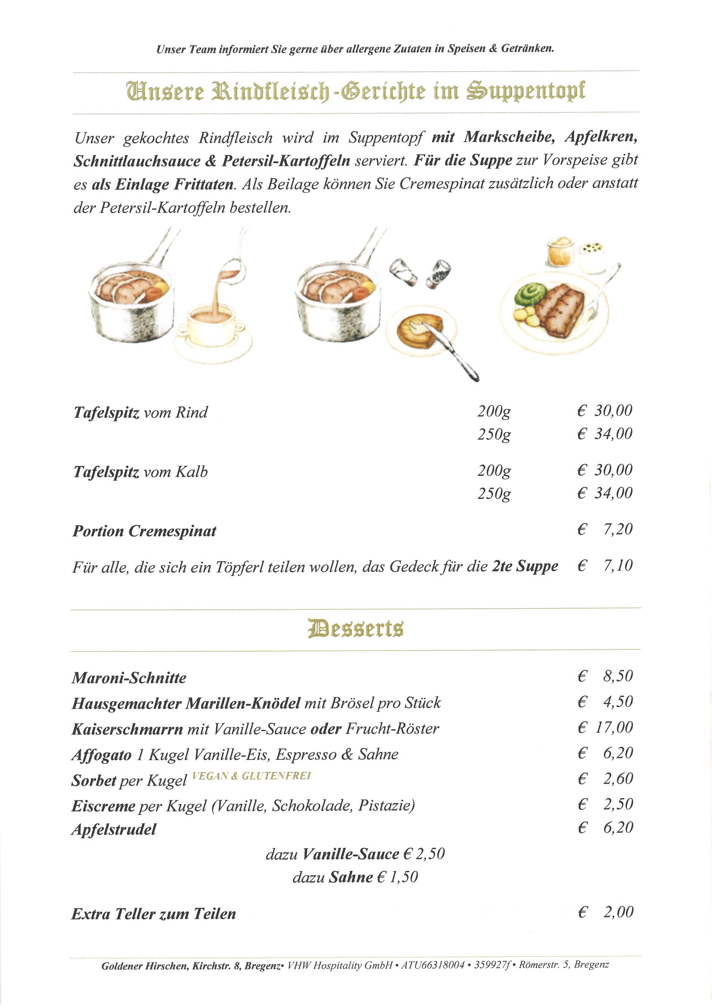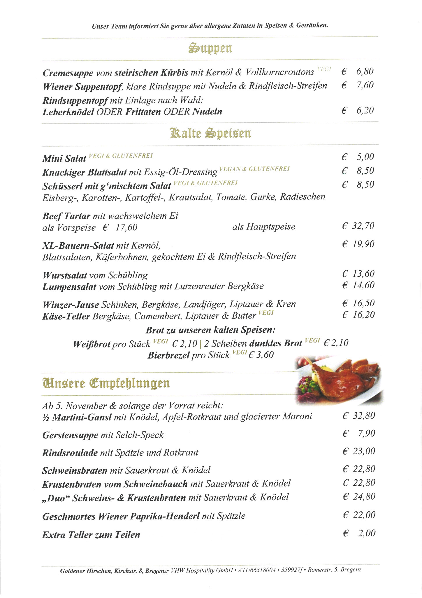 Neben unseren Klassikern nach traditionellen, alt-österreichischen Rezepten wie Gulasch, Wiener Schnitzel und Rindfleisch-Töpferl begeistern unsere Spezialitäten-Wochen mit Knödeln, Spargel, Wild, Gansl oder die Schlachtpartie Groß und Klein!